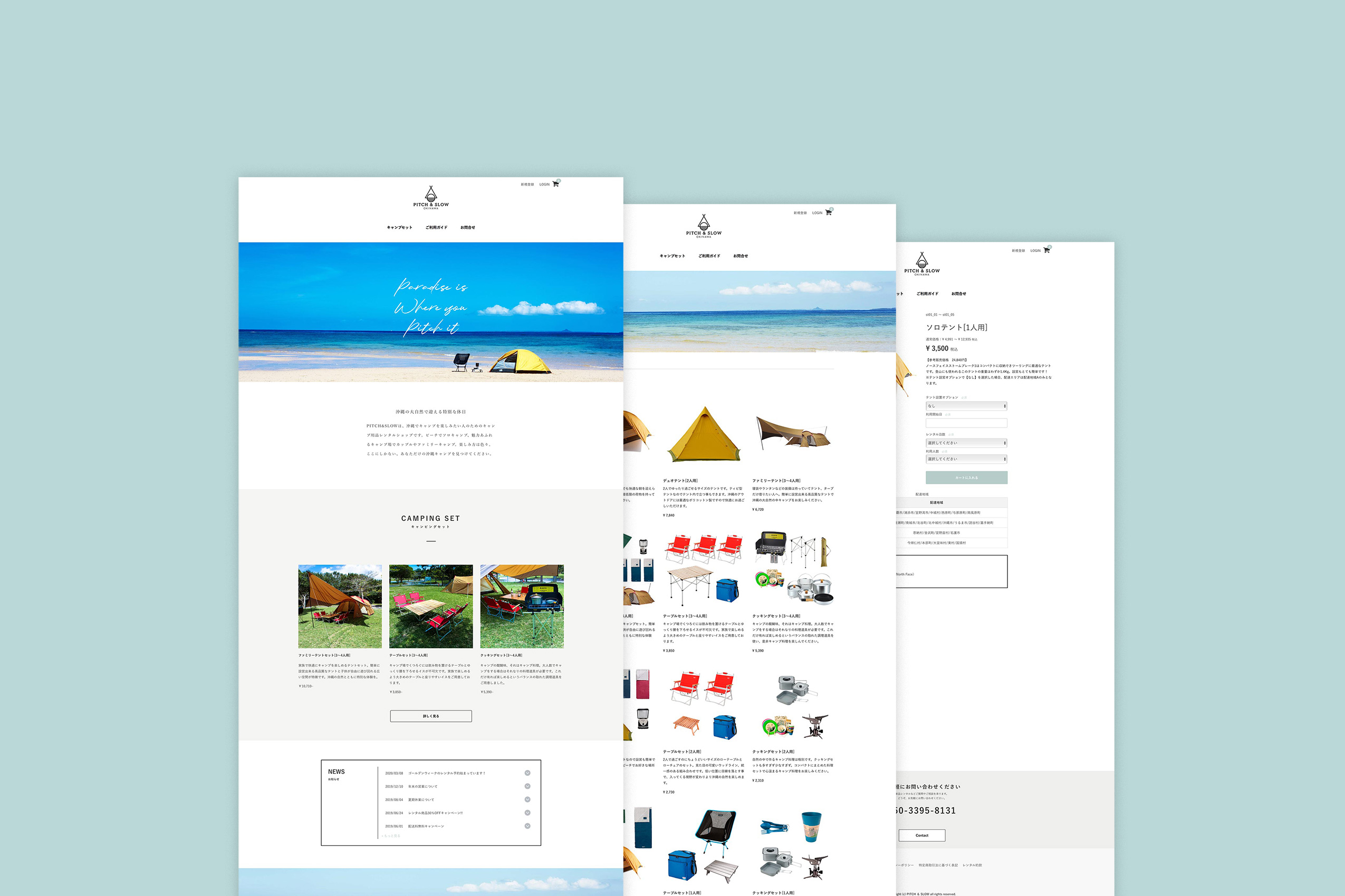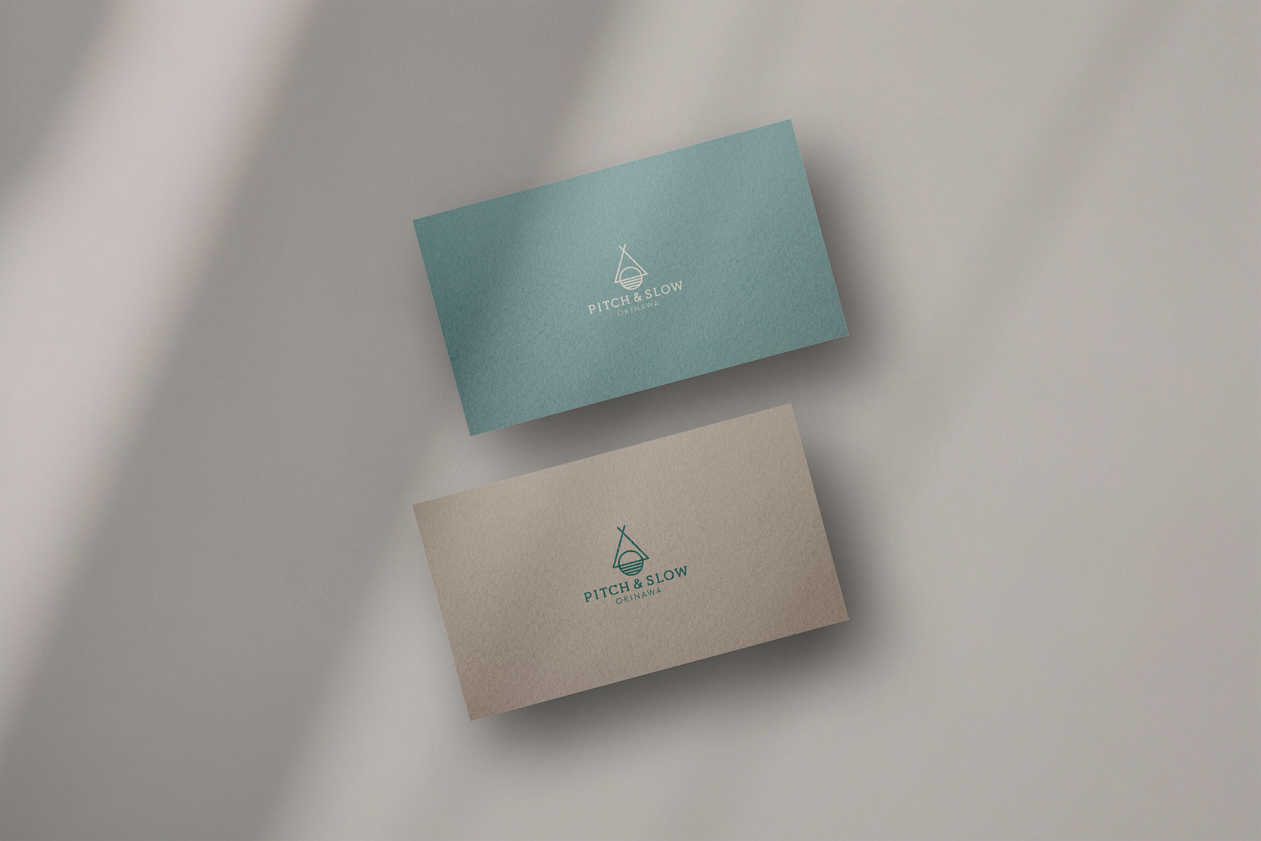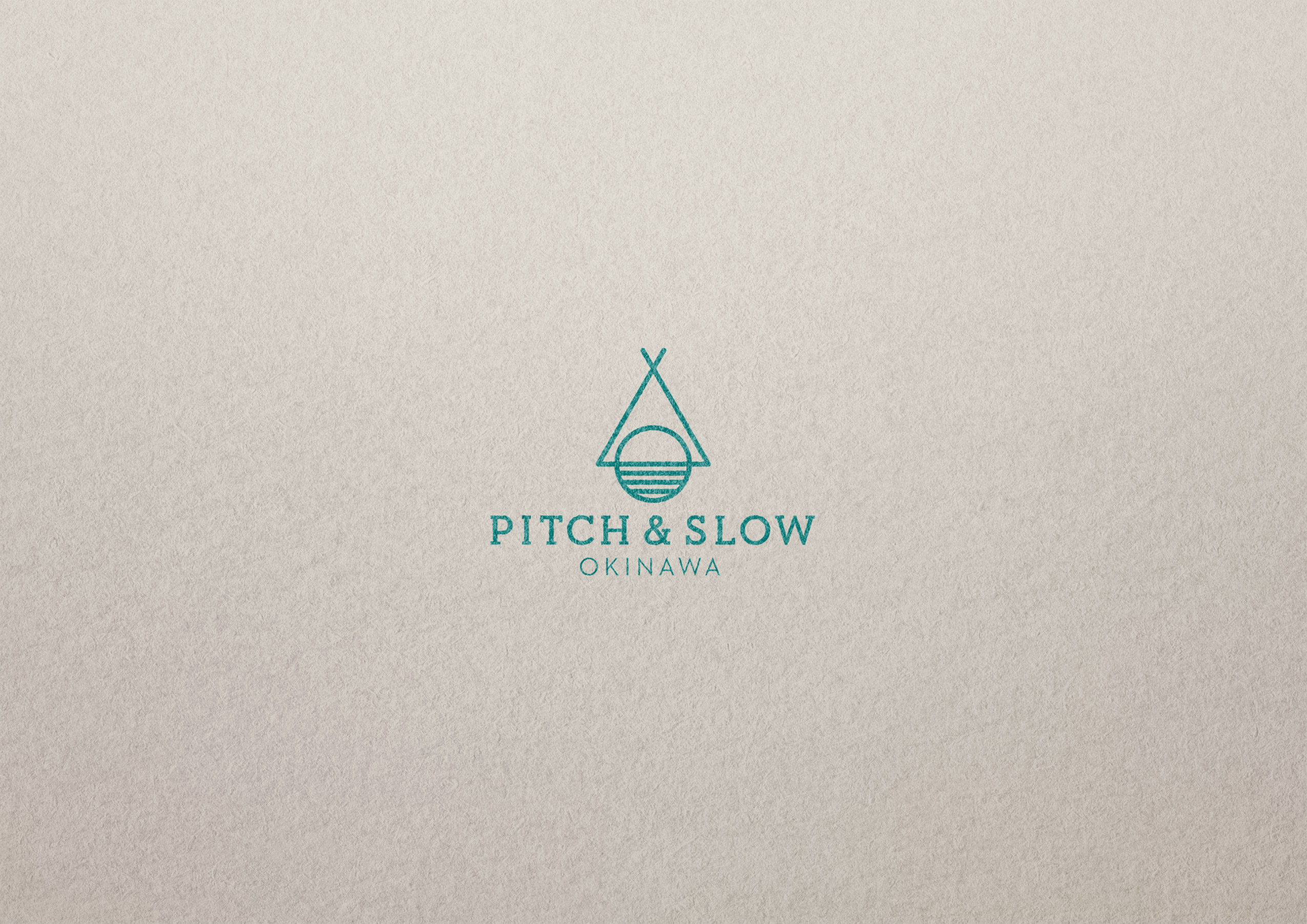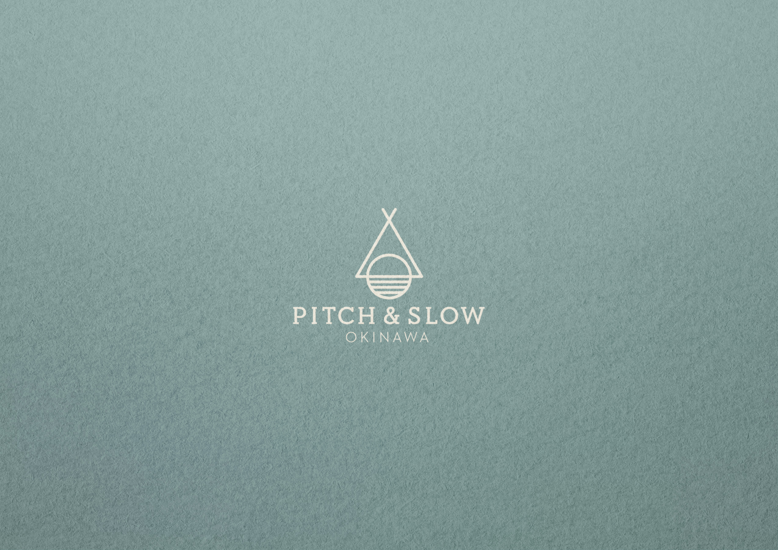 沖縄を中心にハイクオリティーなアウトドア用品を取り扱うショップのためのロゴマークです。ビーチリゾートの印象が強い沖縄で、より深く自然とふれあうことを目的に立ち上げたられたサービスであり、キャンプグッズの貸し出しを中心に幅広くアウトドアと関わり、活動を行っています。名称のPitch & Slowはテントをはることを意味するPitchと、ゆっくりと流れる時間Slowを掛け合わせた言葉で、タグラインは ”Paradise is where you pitch it ” (楽園とはあなたがテントをはる場所)、どちらも雄大な自然の中で味わう特別な感覚を表現しています。PITCHというキーワードが中心となることから、ワードマークは座りがよく、エンドにアクセントがくるスラブセリフの書体を選び、シンボルマークは海から望むサンセットとサンライズそして、テントの関係をシンボライズしています。三角形と円と線の単純化した組み合わせでモダンに仕上げました。