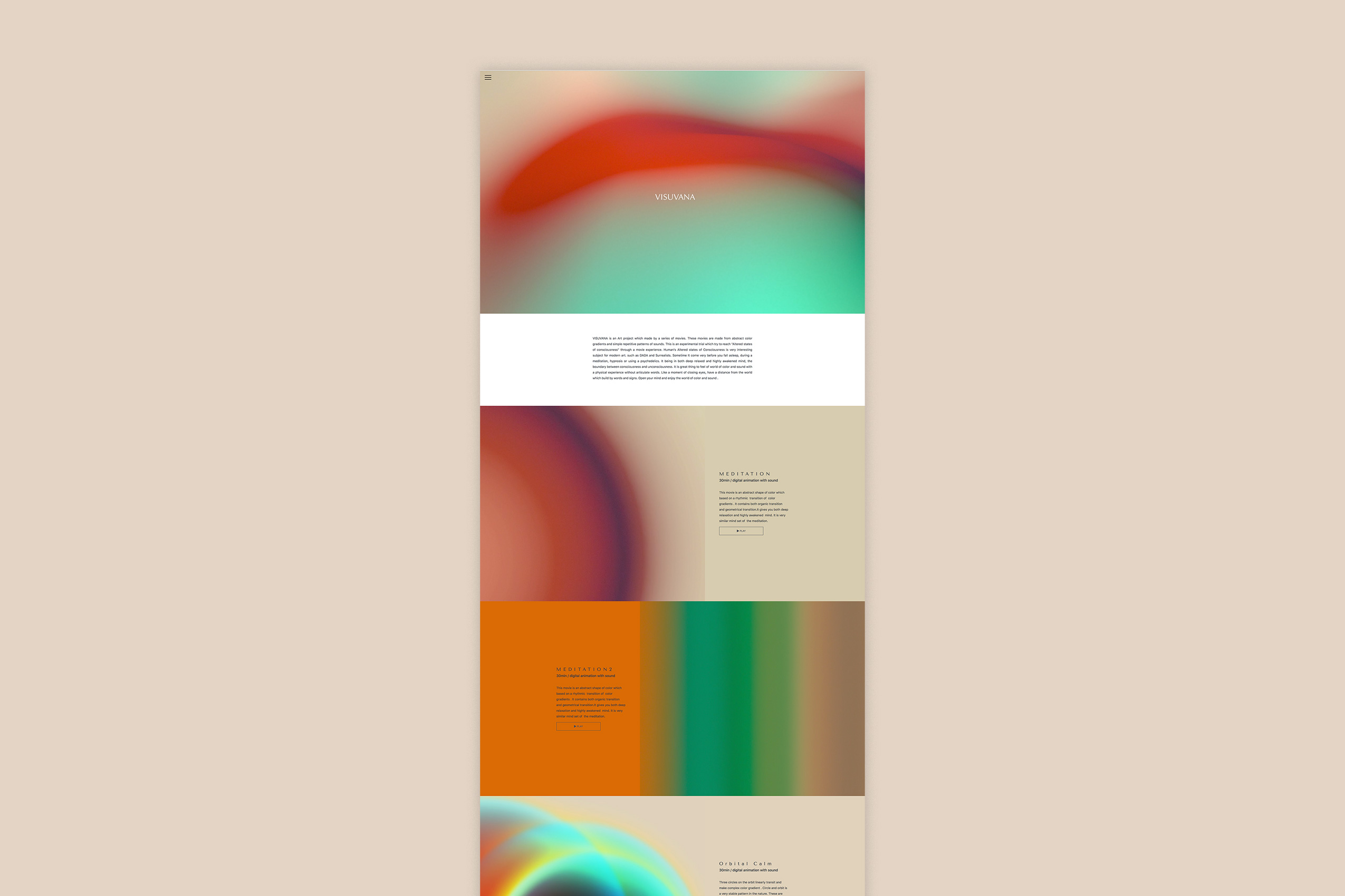 現代的な瞑想のための映像作品を扱うアートプロジェクトVISUVANAのためのロゴです。鮮やかな色彩グラデーションの変化が心地よい映像と、リフレインする音の構成で作られた作品群を公開するためのウェブサイトおよびそのブランディングのためのロゴを作成しました。サイケデリックとも、宗教とも異なる、モダンアートの文脈で変性意識状態を扱う映像作品群を象徴化する目標を置き、VISUAL+NIRVANAからの造語でつくられたVISUVANAという名称をワードマークとして制作しました。ヒューマニストサンセリフといわれる古代ローマの骨格をもつサンセリフ書体でややゆったりめに組まれたワードは普遍的かつモダンな印象を扱うのに相応しい佇まいをもたせています。